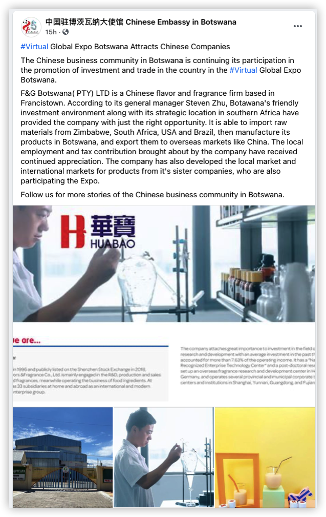 非洲F&G積極參加博茨瓦納全球線(xiàn)上博覽會(huì ), 并獲中國駐博茨瓦納大使館臉書(shū)點(diǎn)贊