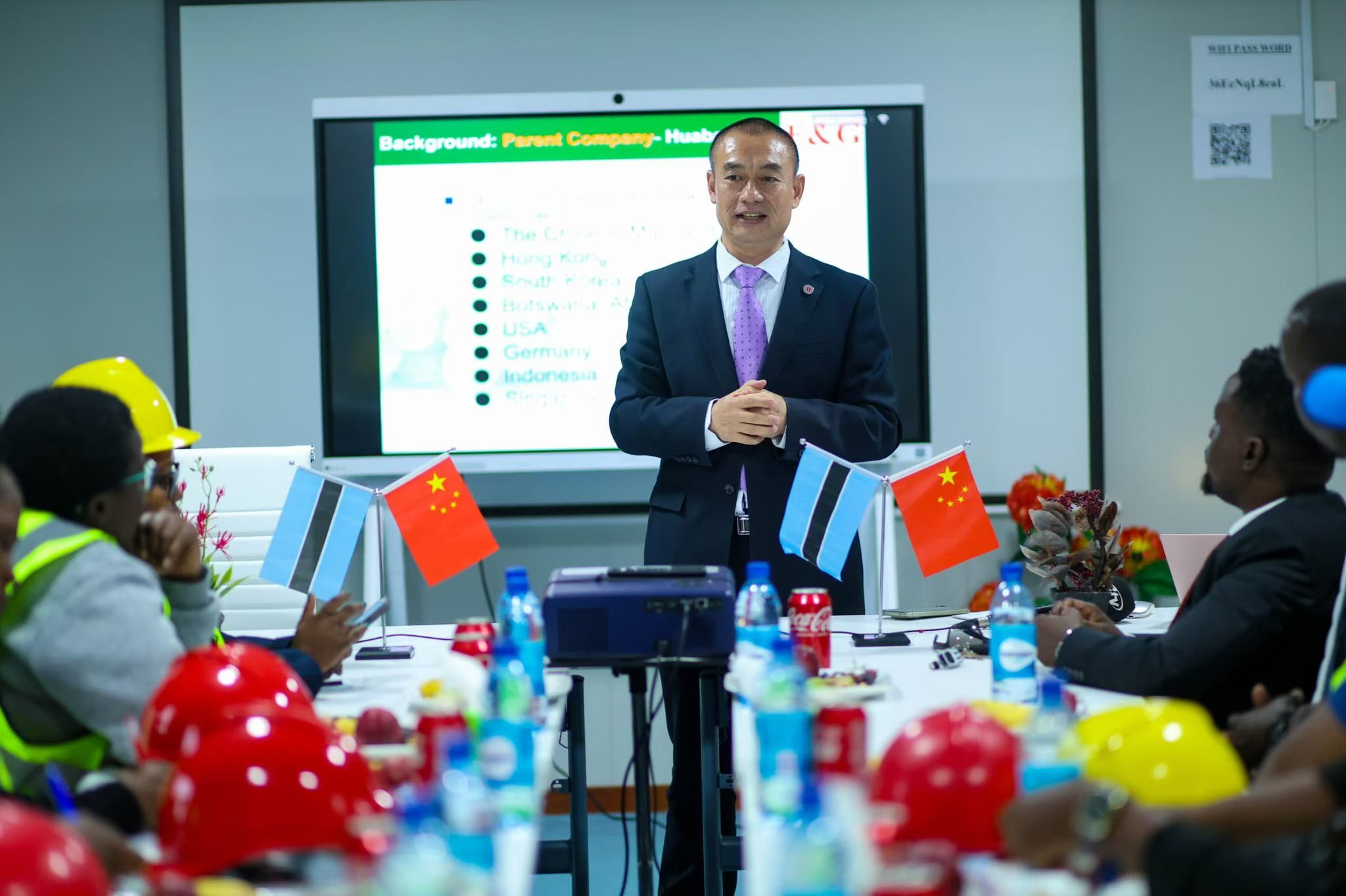 在會(huì )議交流環(huán)節,朱總首先向博茨瓦納政府部門(mén)及媒體記者對中資企業(yè)的關(guān)心支持表示感謝。隨后,朱總介紹了非洲F&G的發(fā)展歷程。非洲F&G自2007年成立以來(lái),克服了非洲地區人才、資源及配套產(chǎn)業(yè)鏈短缺等困難,通過(guò)技術(shù)革新與精益管理成為行業(yè)標桿,產(chǎn)品遠銷(xiāo)國內外市場(chǎng)。在地方發(fā)展貢獻上,企業(yè)吸納近百人就業(yè),緩解區域就業(yè)壓力,為當地稅收做出了貢獻,提升博茨瓦納產(chǎn)品出口份額與國際知名度。在人才培養方面,公司為當地員工提供焊接、叉車(chē)操作等多領(lǐng)域技能培訓,并組織優(yōu)秀員工前往華寶股份總部進(jìn)行學(xué)習交流,通過(guò)實(shí)地考察與專(zhuān)業(yè)課程,助力員工提升技術(shù)管理能力、加深中國文化認知,促進(jìn)文化交流的同時(shí)培養高素質(zhì)人才,實(shí)現管理層本土化率達90%,增強了員工歸屬感。此外,朱總還介紹了企業(yè)主營(yíng)業(yè)務(wù)、核心技術(shù)優(yōu)勢,以及獨具特色的中博互鑒企業(yè)文化,如傳統節日慰問(wèn)、語(yǔ)言文化交流等,非洲F&G一直在推動(dòng)中博經(jīng)濟合作中不斷實(shí)踐。