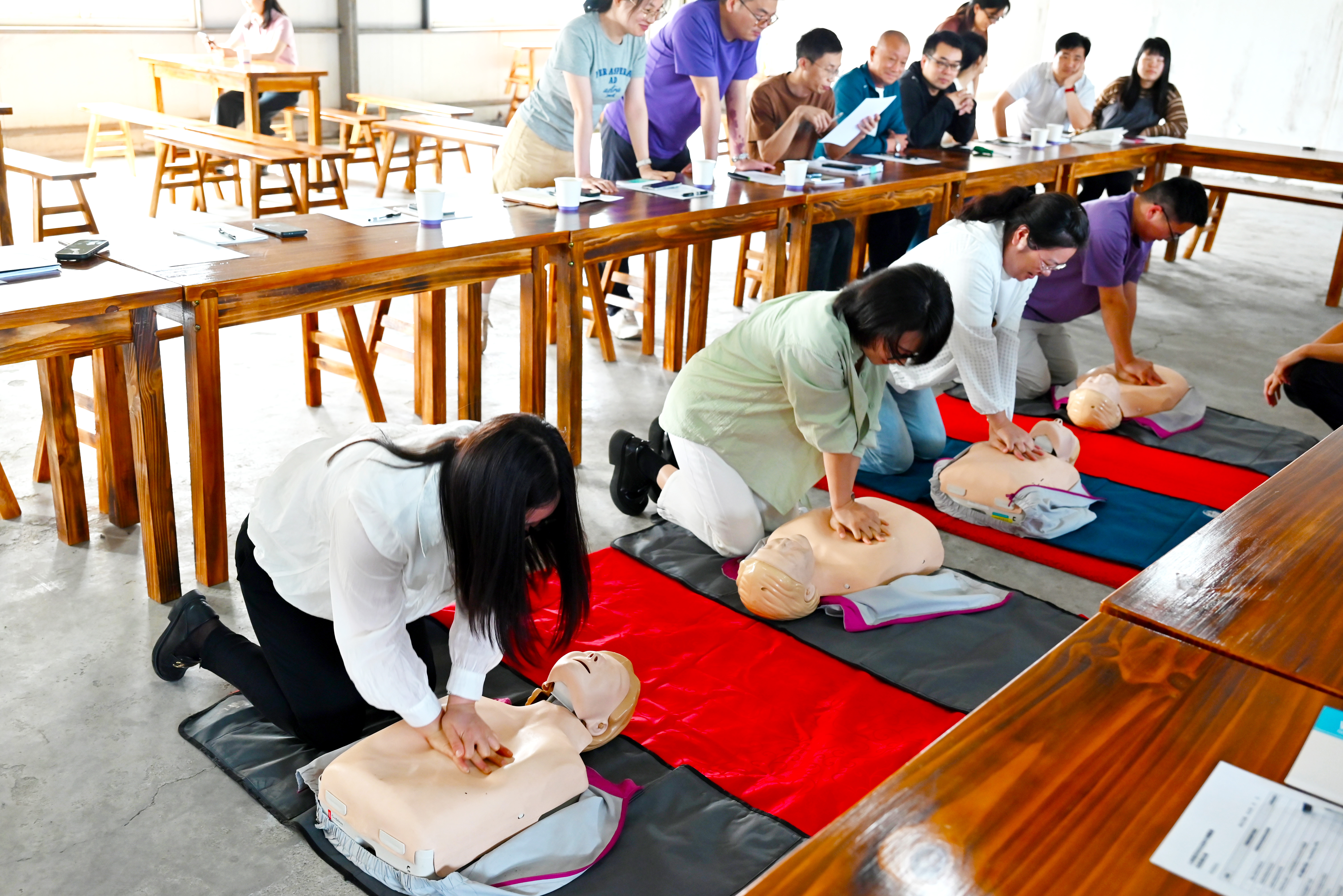 “1001、1002、1003……患者無(wú)自主呼吸,立即實(shí)施心肺復蘇!”在國際認證急救講師的指導下,學(xué)員們全神貫注投入演練。從判斷意識到胸外按壓,再到AED除顫儀的操作使用;從識別急癥情況到冷靜應對處置,每一個(gè)動(dòng)作都反復練習、力求到位。培訓現場(chǎng)“沉浸式”氛圍拉滿(mǎn):學(xué)員輪流跪地實(shí)操,模擬真實(shí)急救場(chǎng)景,導師手把手糾正手勢力度。通過(guò)“理論+演示+考核”的闖關(guān)模式,大家真正把技能牢牢掌握在手!