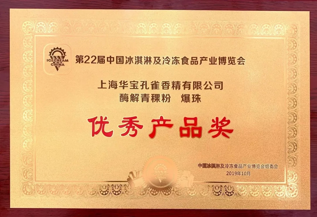 在本次行業(yè)年會(huì )舉辦的第22屆中國冰淇淋及冷凍食品產(chǎn)業(yè)博覽會(huì )優(yōu)秀產(chǎn)品頒獎儀式中,上海華寶孔雀香精有限公司憑借酶解青稞粉、食用爆珠榮獲優(yōu)秀產(chǎn)品獎。