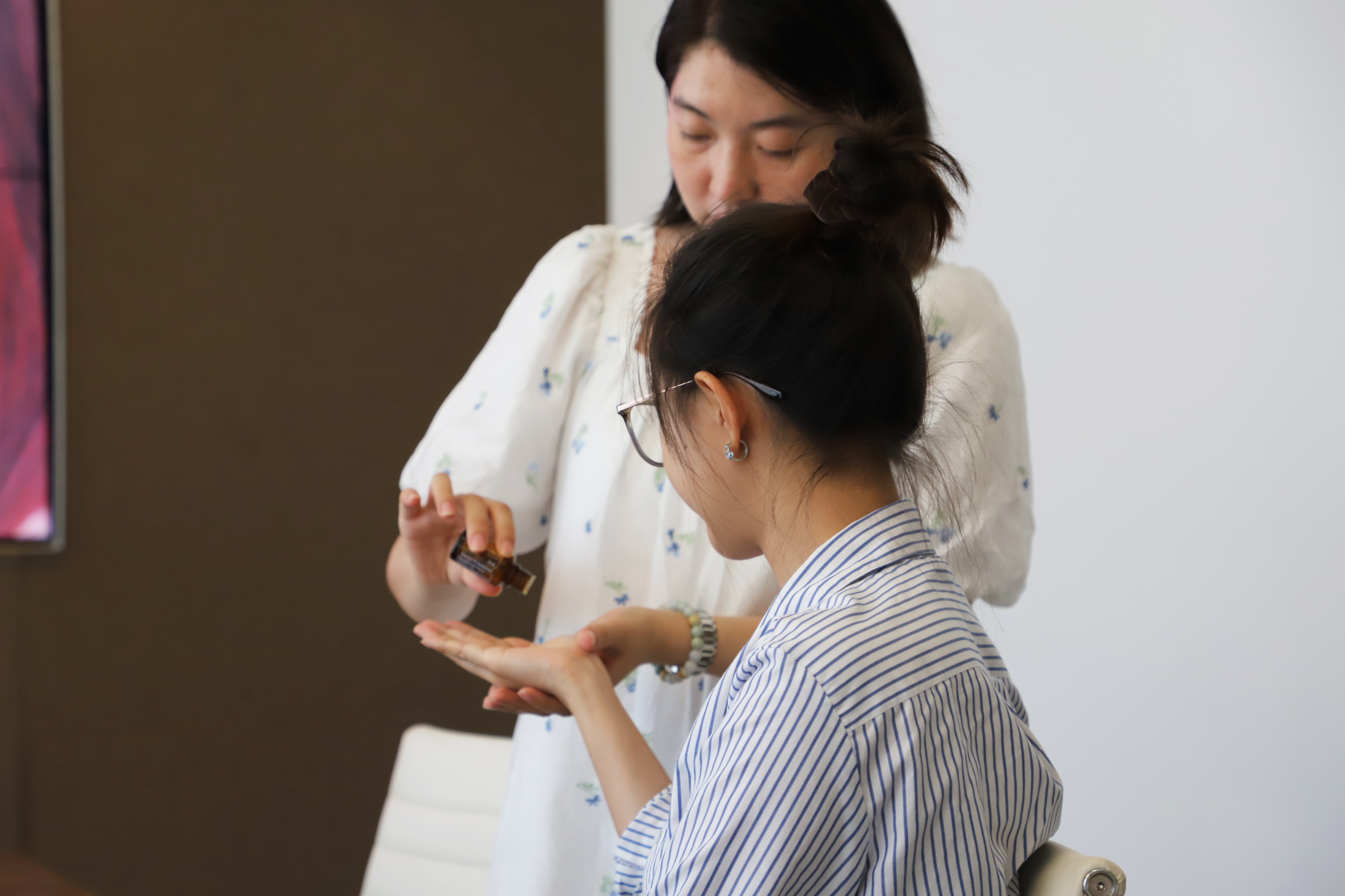 老師在學(xué)員掌心滴入氣味清新的精油,通過(guò)嗅吸精油的香氣、調節呼吸頻率,來(lái)放松身心、緩解疲勞。在老師的指導下,大家通過(guò)精油按摩肩頸,達到舒緩和減壓的效果。