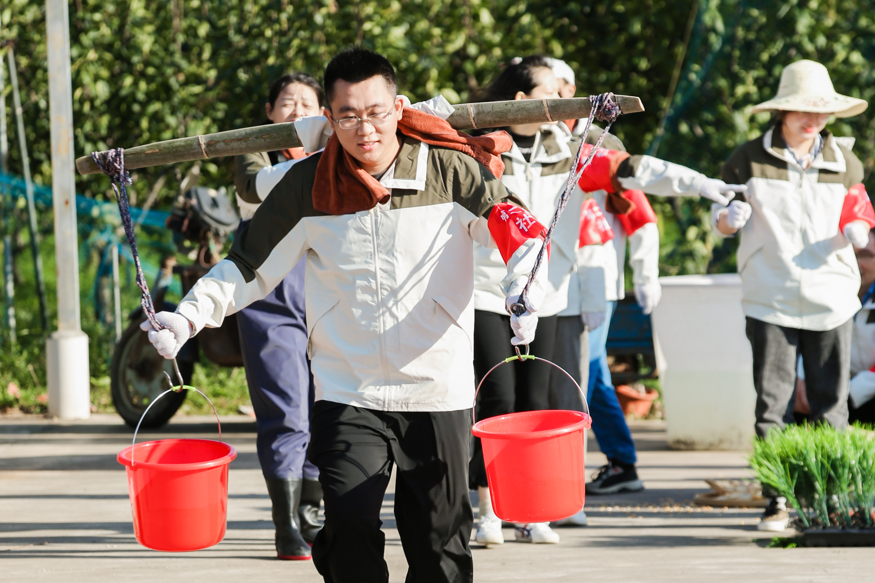 活動(dòng)第一天,大家來(lái)到了種植采摘園,團隊通過(guò)生產(chǎn)大隊分組的形式進(jìn)行了一場(chǎng)農事趣味運動(dòng)會(huì )比賽,各大隊之間展開(kāi)了舉輪胎、挑水、插苗、刨玉米、犁地、扎稻草人等農事運動(dòng)比拼,現場(chǎng)你爭我趕、歡聲笑語(yǔ)、氛圍熱烈。在運動(dòng)比拼中團隊一起協(xié)調合作,既了解了農事活動(dòng)相關(guān)常識,又能鍛煉體能、激發(fā)團隊能量。